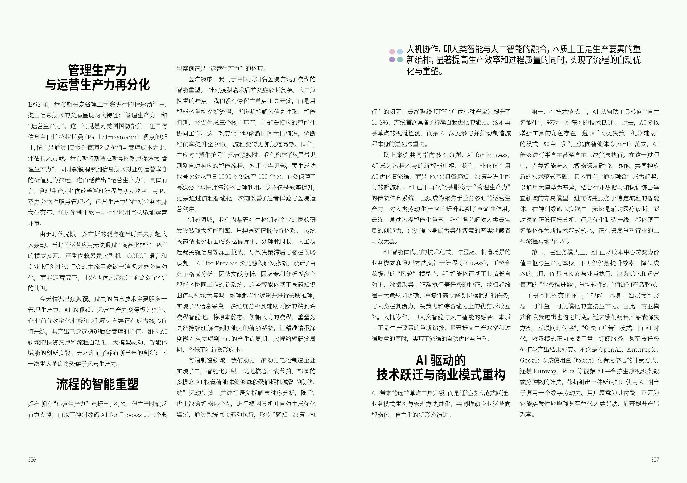 从乔布斯提出的管理生产力和运营生产力,到AI for Process的落地实践,AI通过重塑流程,正在成为运营生产力的核心引擎。这不仅验证了技术范式、业务模式与管理方法协同演进的“风轮”理论,更标志着企业运营进入了人机智能深度融合、生产要素被系统性重新编排的新阶段。面向未来驾驭这一变革,将是我们释放无限创造力的关键。