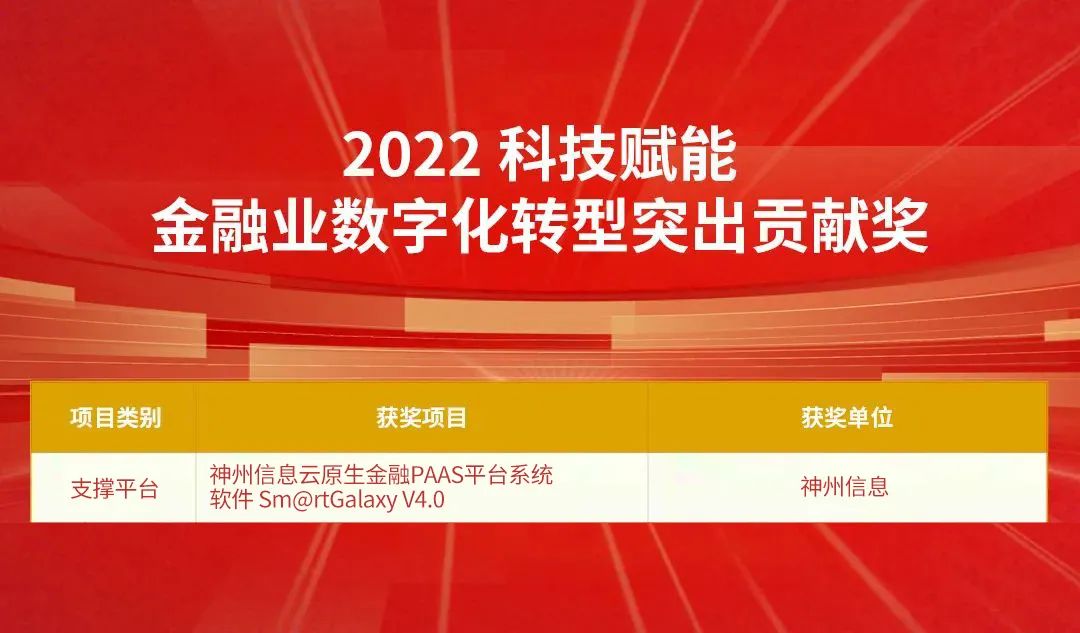 神州信息Sm@rtGalaxy4.0云原生金融PAAS平台获评“2022科技赋能金融业数字化转型突出贡献奖”。