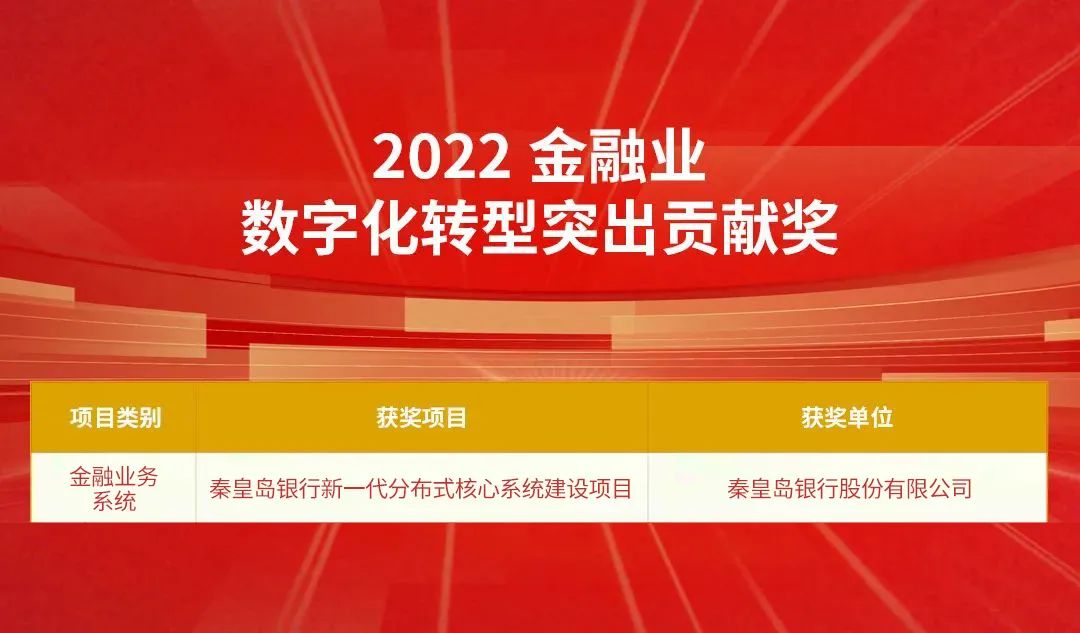 由神州信息参与建设的“秦皇岛银行新一代分布式核心系统建设项目”和“泉州银行新一代核心项目群”分别获评“2022金融业数字化转型突出贡献奖”和“2022金融业科技赋能业务创新突出贡献奖”。